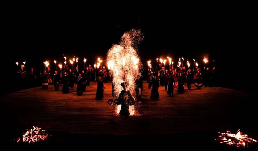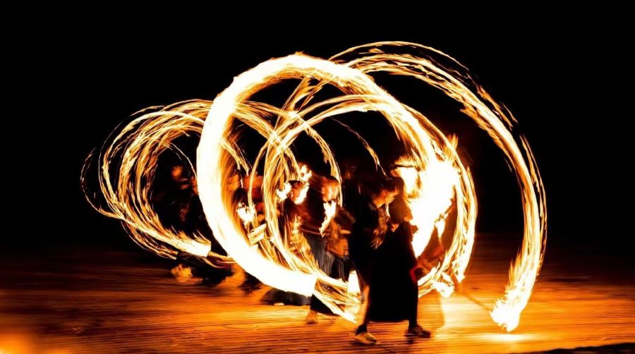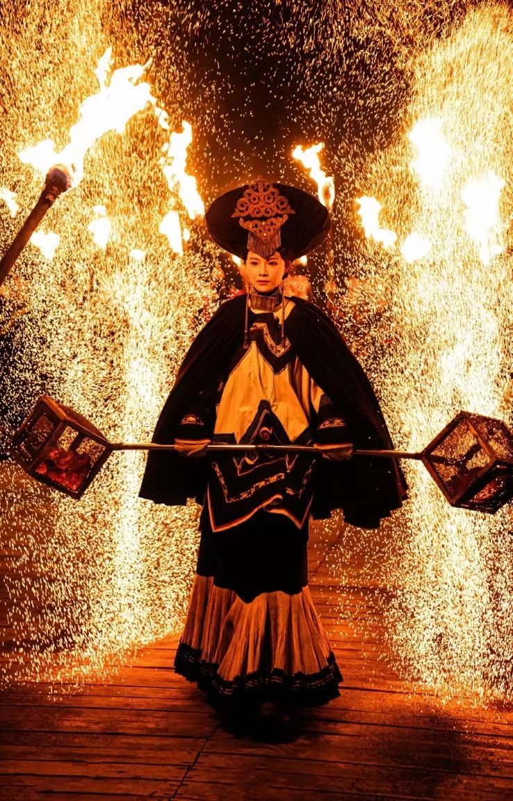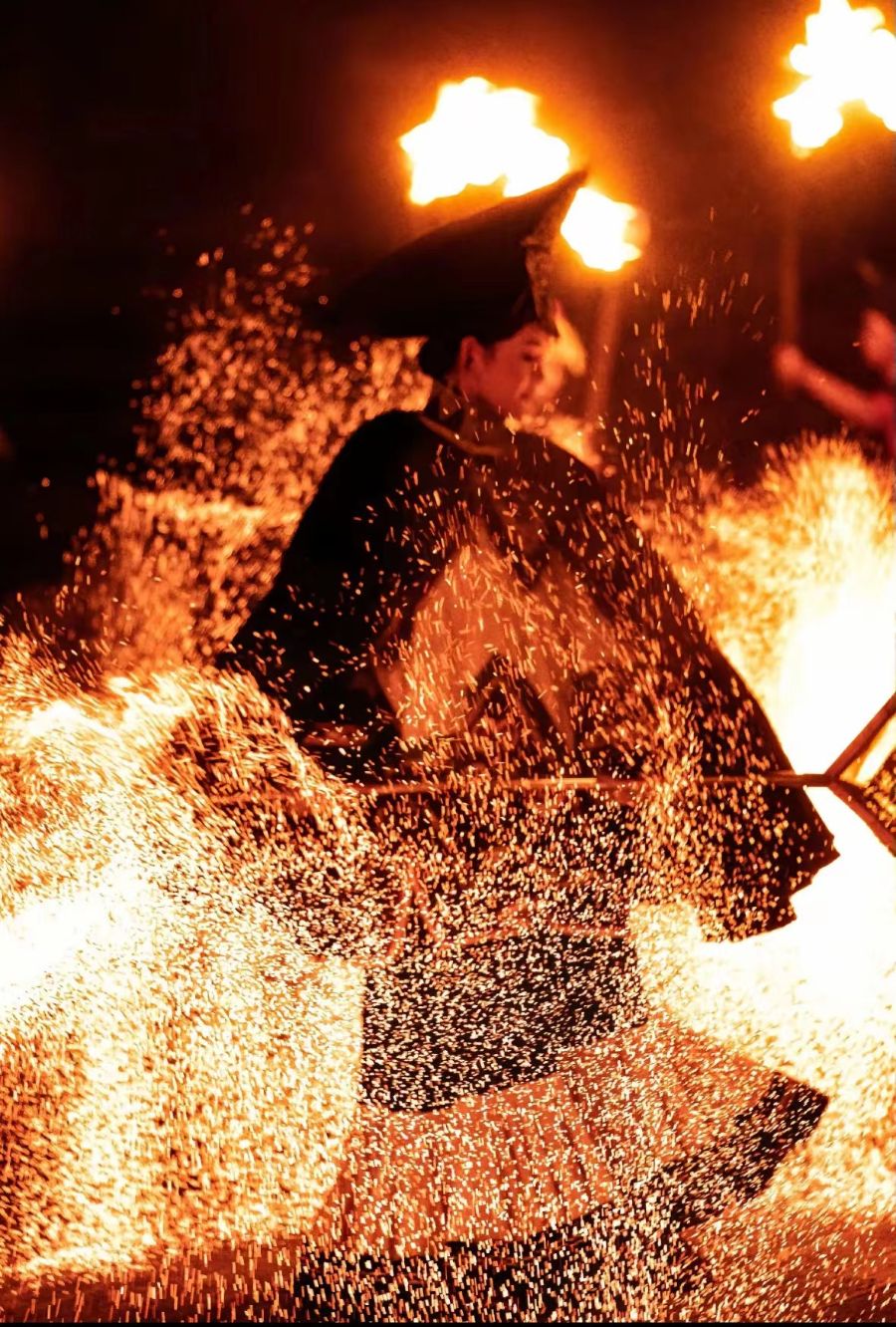 火壶表演,以火为媒,以壶为载。当夜幕降临,焰火点燃,化为璀璨星光识,表演者那双手一抖、一敲、一洒,如星河闪烁,传递祝福,驱走邪崇。