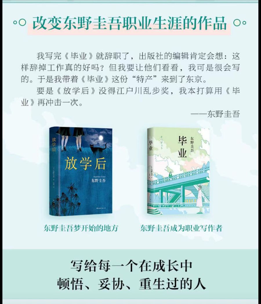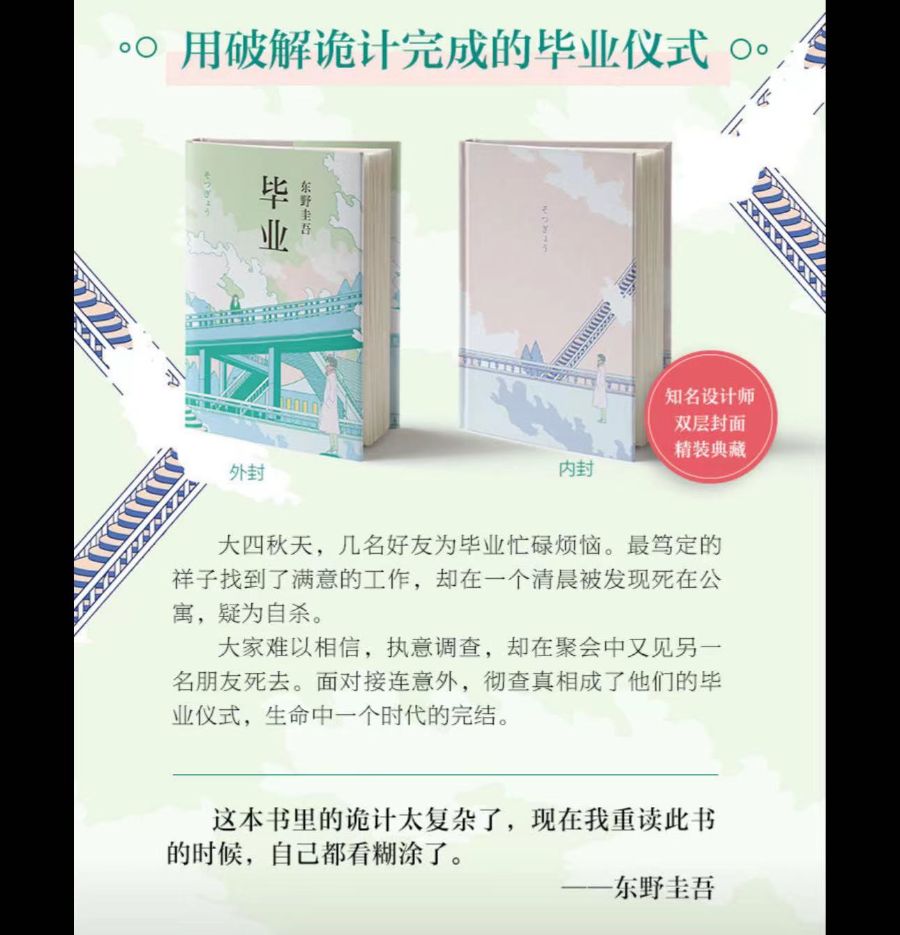 《毕业》是日本作家东野圭吾早期创作的推理小说,1986年5月由日本讲谈社出版发行单行本,最初的名字为《卒业―雪月花杀人ゲーム 》,1989年5月8日由讲谈社出版文库本,改名为《卒业 》。《毕业》是东野圭吾创作的加贺探案系列的第一部。《毕业》中主人公加贺恭一郎马上面临大学毕业,为了避免重蹈父亲的覆辙,加贺准备选择并不适合他的教师职业。而在朋友遇害的案件中,他的侦探天赋展现无遗。