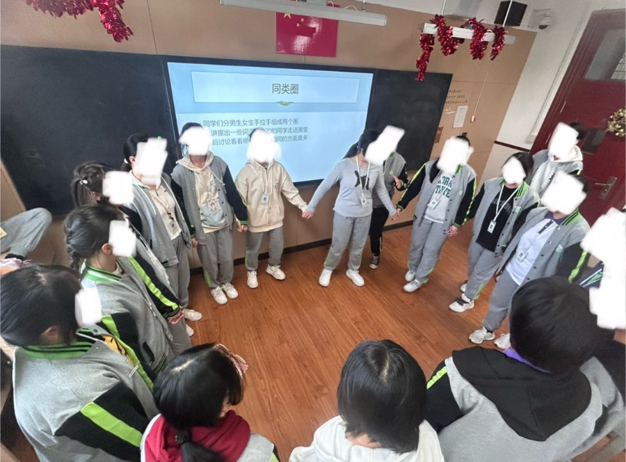 开始先以一个小故事引入 随即开展了一个名叫“同类圈”小游戏 大家一同拉手围圈  以主持同学说出其中一个小特征 带有特征的同学进入圈中!找到了很多相同特征的同学哦