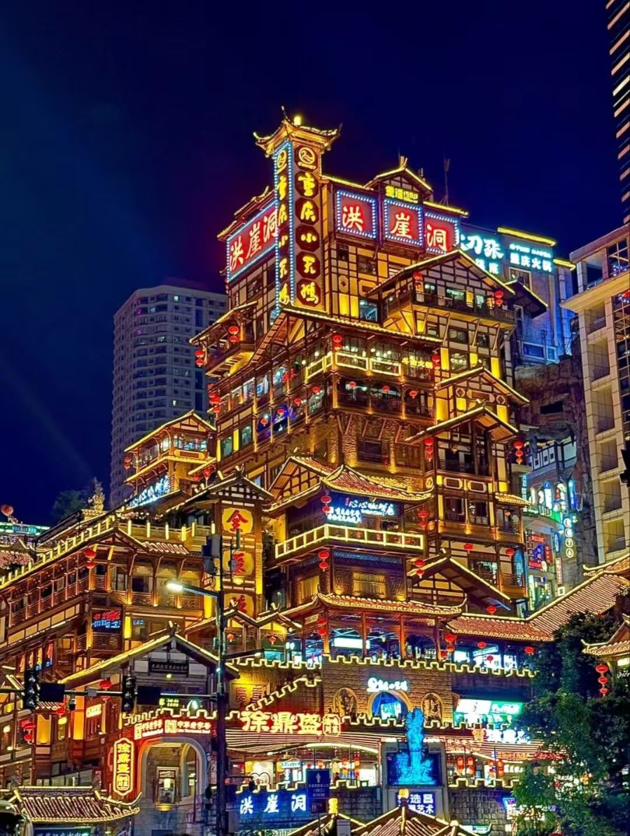 洪崖洞:位于长江和嘉陵江交汇处,是一处集吃、喝、玩、乐于一体的多层次建筑群,依山而建的吊脚楼建筑群,夜晚的灯光尤为迷人。