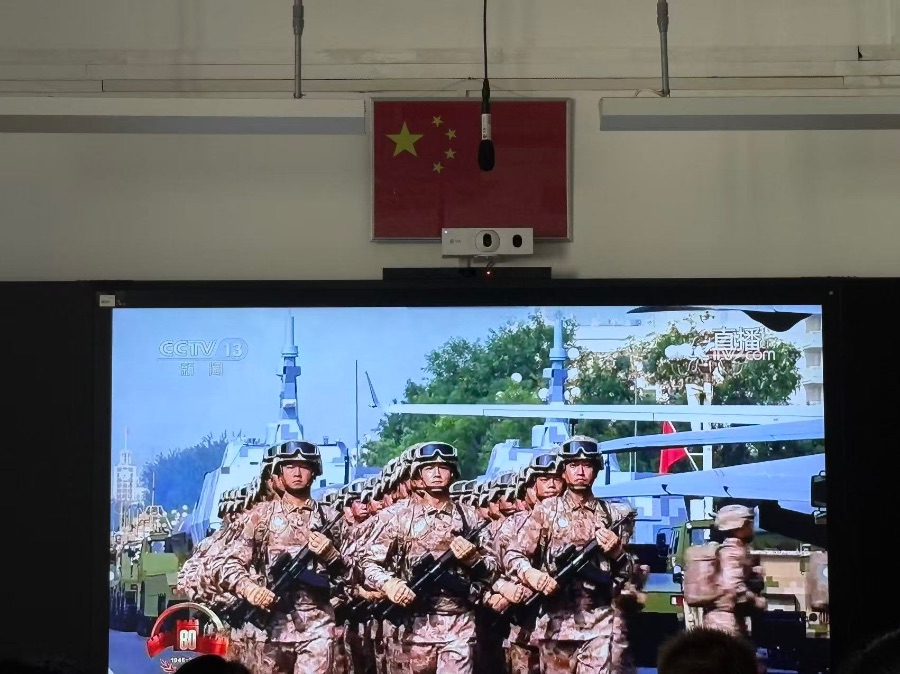 教室里鸦雀无声,全班同学的目光都紧紧锁定在屏幕上。当徒步方队迈着铿锵有力的步伐走过天安门,那整齐划一的动作、挺拔如松的身姿,让我忍不住和同学们一起屏住呼吸。紧随其后的装备方队更令人震撼,坦克、导弹等先进武器依次亮相,彰显着祖国的硬核实力。