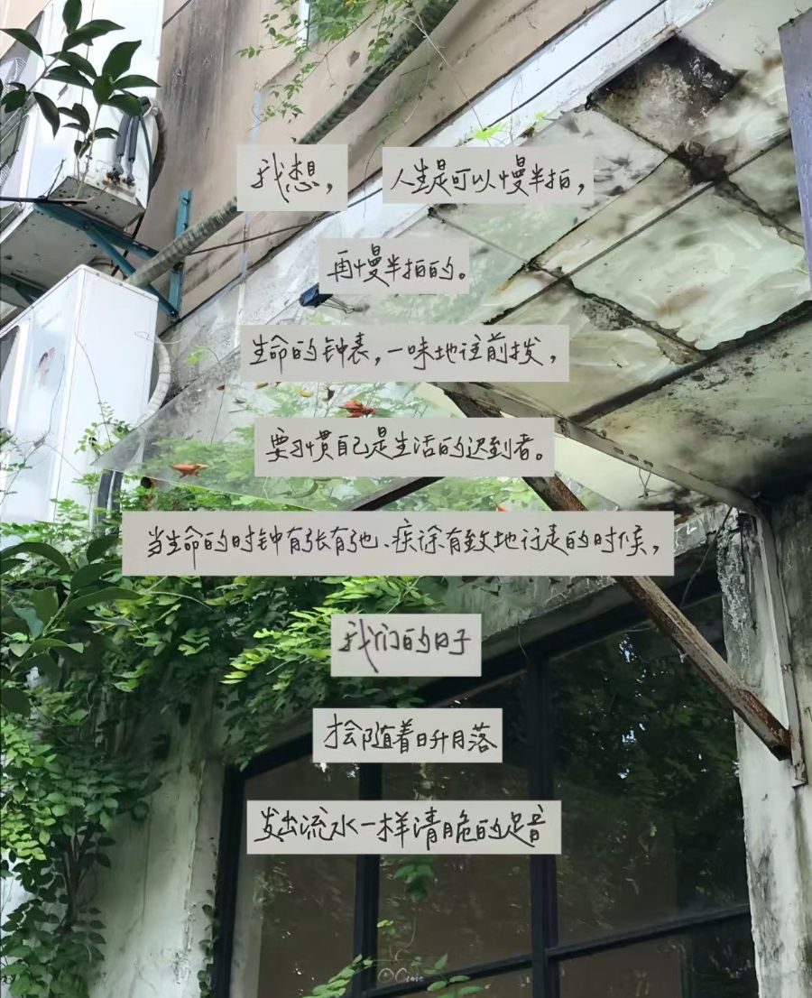 在某个疲惫的深夜,读到一段话,是迟子建先生的《是冬天也是春天》:“我想人生是可以慢半拍的,生命的钟表不能一味的往前拨,要习惯自己是生活的迟到者,当生命的时针张弛有度,疾徐有致地行走的时候,我们的日子,才会随着日升月落,发出清脆的足音。”