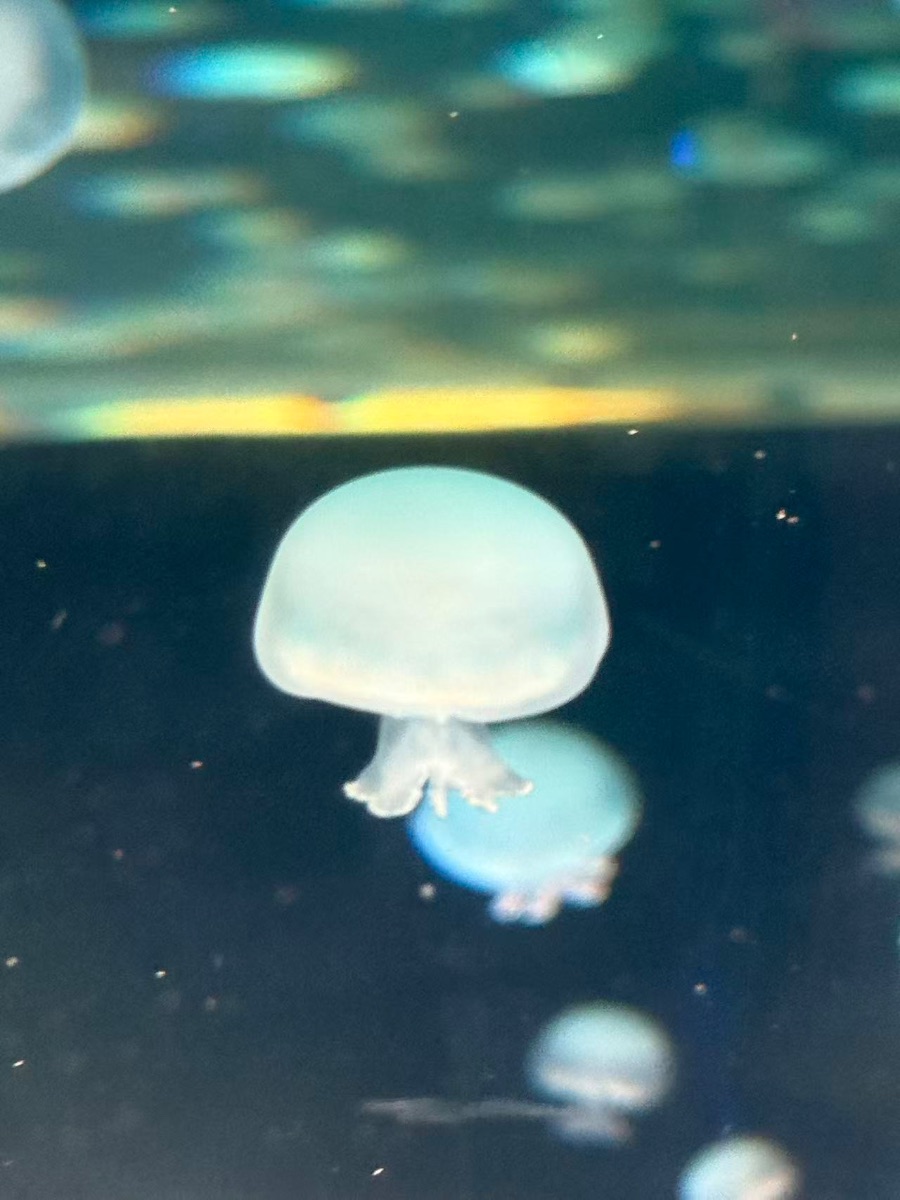 站在水族馆的展缸前,我的目光完全被这些小水母吸引了。它们像是从童话里游出来的精灵,淡蓝色的伞状体圆润可爱,在水中慢悠悠地舒展、收缩,底部的触须轻柔地飘动,每一个动作都优雅得不像话。我静静地盯着它们,看着它们在幽蓝的水域里穿梭,灯光打在它们透明的身体上,折射出朦胧的光晕,仿佛整个世界都慢了下来。那一刻,所有的烦恼都被隔绝在外,我仿佛也变成了它们中的一员,在这片静谧的“海洋”里自由游荡。直到离开时,我还忍不住回头望了几眼,心里满是对这些小生命的惊叹与喜爱,这场邂逅,是我与海洋浪漫的一次温柔共鸣。