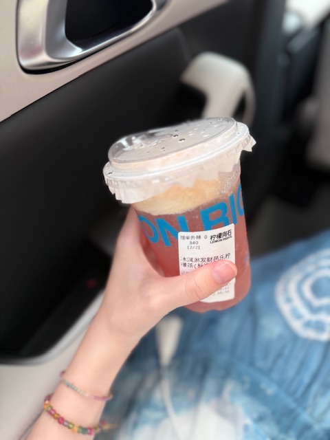 标签上清晰标注着产品信息,“冰淇淋发财芭乐柠檬茶”的组合充满创意,芭乐的清甜、柠檬的酸爽与冰淇淋的醇厚交织,想想就知道口感多有层次。手握这杯茶饮,在车内的场景更添了几分随性的惬意,手腕上彩色的手链与蓝白的衣着相衬,整体画面充满了夏日的活力感。