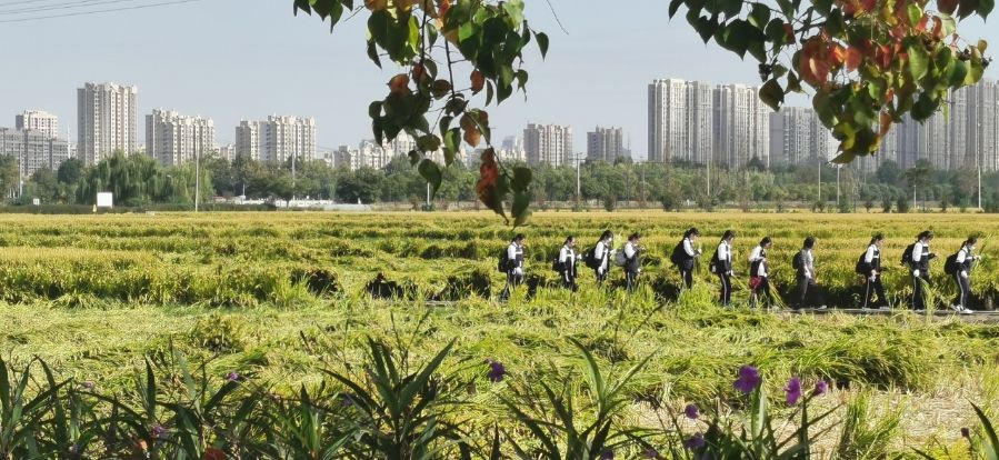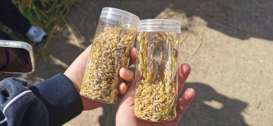 今天我们来到了嘉北郊野公园,刚刚进入园区映入眼帘的就是一大片水稻,我今天也体验了割水稻,就割了一小把,将水稻割下来后,我和其他同学就一握着稻杆在竹筐中拍打,拍打完之后我们就用工作人员给的小罐子把竹筐中的稻谷收集起来。体验完割水稻之后,我们还看了机器是怎么割水稻的,我们就在大草坪上拍了集体照,然后就是自由活动时间,我们小组的成员在一起吃着东西玩着小游戏,其乐融融的。这次的秋游比我预期之中的要有趣许多,割水稻也没有想象中的那么无趣,那片金黄色的稻田在我心中比其他景色要美丽许多