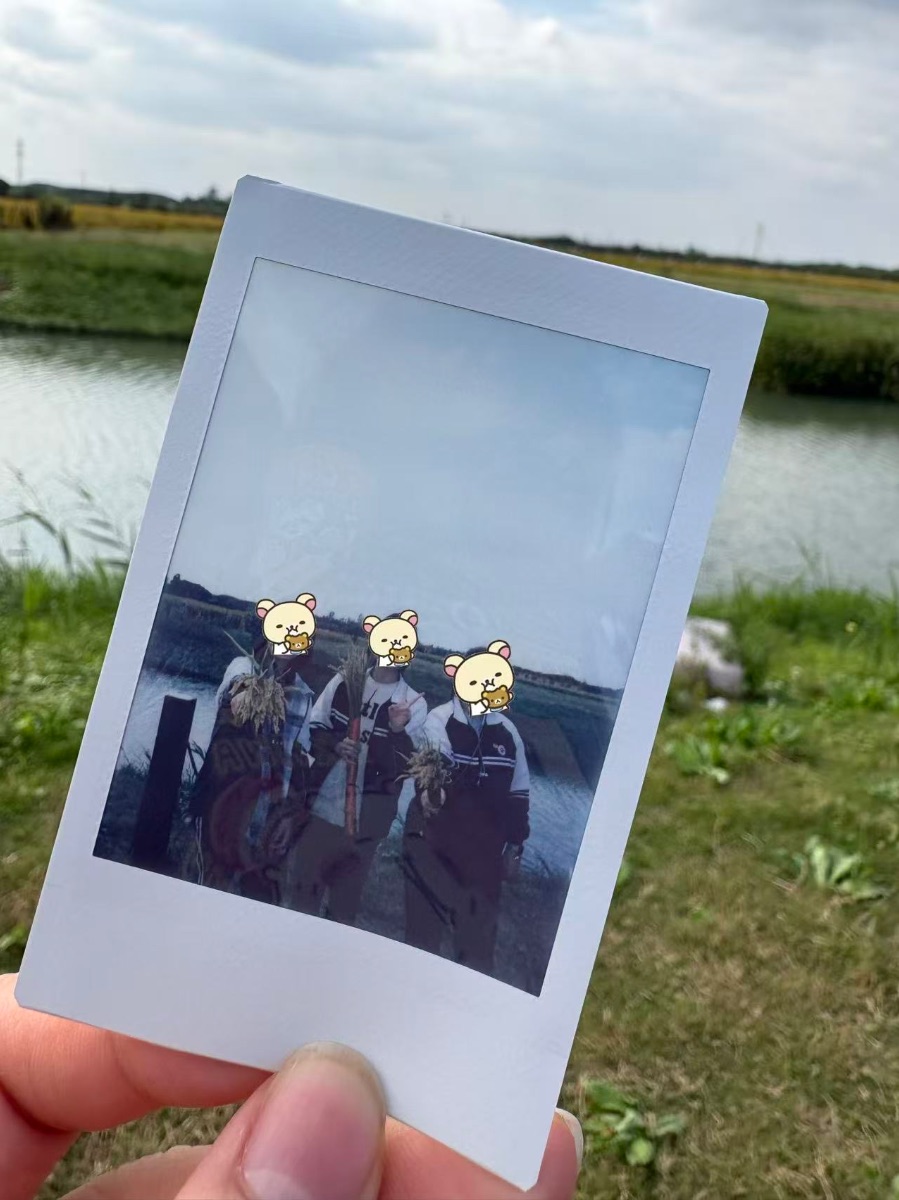 秋游那天,阳光像刚洗好的棉布,软软地铺在嘉北郊野公园。我和阿初一人捏一只拍立得,钻遍枫林与稻浪。我把镜头对准她,她正用麦穗捂耳朵,像偷听秋天的心跳,咔嚓,白边相片吐出,金黄在她睫毛上跳舞。她反拍我,我抱南瓜摔进落叶堆,笑得像裂开的石榴。两张相片贴在一起,风把叶影吹成波浪,我们跑向芦苇荡,把这一刻举过头顶,让阳光给相片镀上一层毛茸茸的边。归途车上,照片夹进日记,像把糖纸藏进课本,甜到冬天。大家都十分的开心。