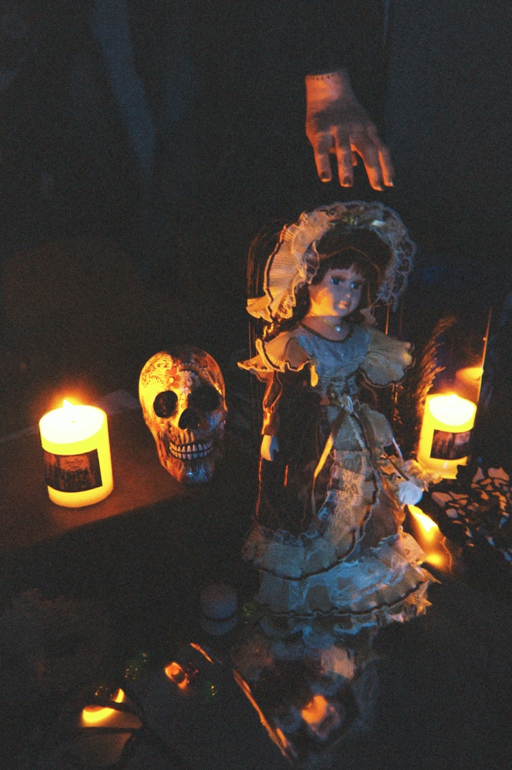 幽暗的环境里,烛光摇曳,几支蜡烛散发着暖黄的光晕,将周围的事物映照得忽明忽暗。一侧的骷髅头装饰布满了精致的花纹,透着浓郁的节日气息;中间的复古风玩偶穿着层叠的蕾丝裙装,戴着华丽的帽子,在光影下更显诡异。上方还伸出一只带着复古感的手,仿佛在营造一种奇幻又惊悚的氛围。整个场景融合了黑暗、神秘与节日的狂欢感,每一处细节都在诉说着万圣节特有的诡异与趣味,仿佛将人带入了一个充满奇幻色彩的灵异世界。