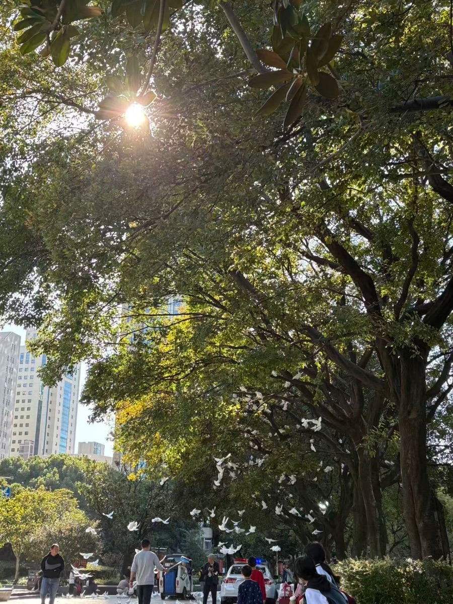 写生课上,我支起画板,忽听“扑啦啦”一阵风响。抬头一看,一群灰白相间的鸽子正从屋顶俯冲,像撒出的碎纸片,纷纷落在一棵老槐树上。它们盘旋几圈,找准枝条,爪子一缩,枝叶轻颤,阳光被拍打成跳动的光斑。我数了数,足有二十多只,有的互相整理羽毛,有的咕咕低语,树冠瞬间变成热闹的广场。我悄悄换支细笔,想把这动态定格,却发现颜料不够表现它们翅尖的亮银。忽地,一只领头的鸽子又带头起飞,整群跟上,像灰云掠空,枝条空留晃动的余韵。我低头在画纸留白,让那片飞翔留在想象。