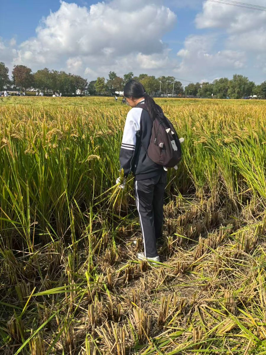 看了同学的我开始自己割了起来,左手抓麦秆,右手握镰刀贴地发力。我学着尝试,起初总割不齐,旁边同学耐心教我调整姿势,慢慢的,我终于能熟练收割了。汗水浸湿了校服,手心也磨出红印,但却很开心