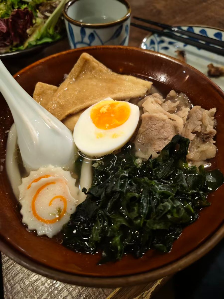 滑溜溜的粗乌冬裹满豚骨汤香,溏心蛋咬开那瞬间蛋液流心,肥牛嫩得裹满鲜味,还有吸饱汤的油豆腐、脆爽的海草,连那个小花形状的鱼糕都Q弹入味!