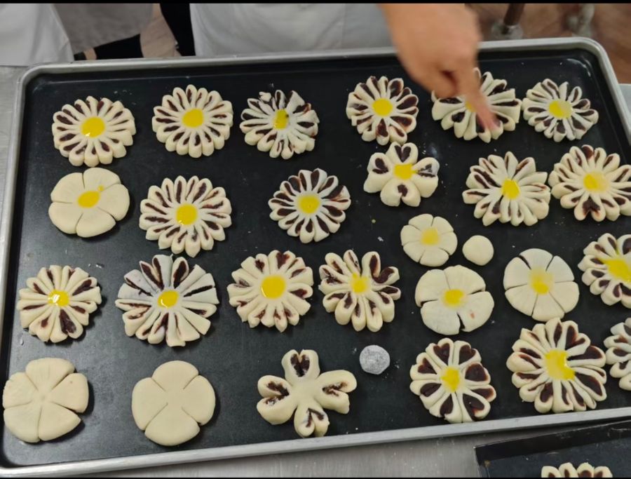 后厨的不锈钢操作台前,一个个像小雏菊一样的花形面点整整齐齐躺在烤盘里,花瓣的纹路清晰又可爱。