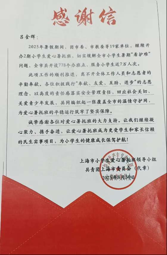 近日,学校计算机系24005计算机网络技术(大数据)中高职班学生吕金辉,因积极参与2025年上海市小学生爱心暑托班志愿服务,荣获由共青团上海市委员会、上海市志愿者协会和上海青年志愿者协会联合颁发的服务证书及感谢信。