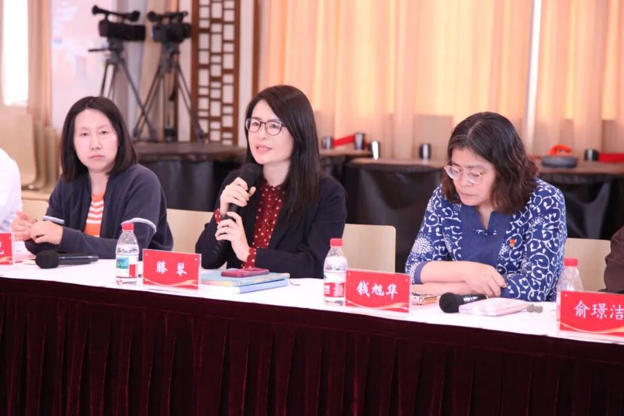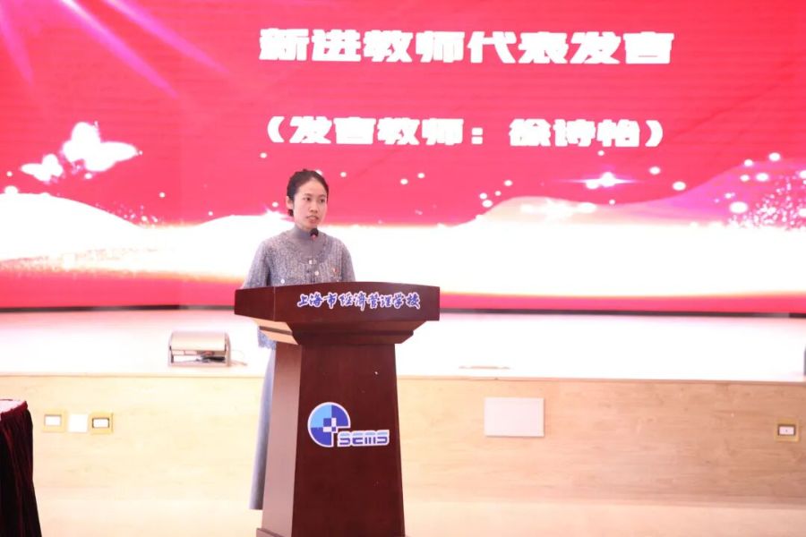 作为新进教师代表,徐诗怡老师上台发言。她提到学校“传帮带”平台为新教师成长提供支撑,前辈教师的专业素养与教育情怀值得学习,并表示未来将主动向带教老师学习,以项目驱动教学激发学生创作热情,融合经济管理思维拓宽教学视野,助力学生在艺术设计学习中兼顾美学与实用。