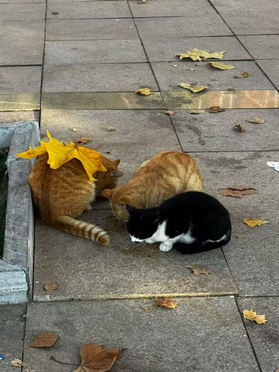 深秋的午后,阳光把方砖铺就的步道烘得暖融融的,几片金黄的梧桐叶打着旋儿落在石缝里,像谁遗落的碎金。三只猫凑在石边的阴影里,把小小的食盆围得密不透风——其实那不过是洒在砖上的一把猫粮,却成了此刻最热闹的宴席。左边那只橘猫最有意思,一片比它耳朵还大的黄叶盖在背上,像顶了顶滑稽的小帽子,尾巴尖轻轻勾着,还在慢悠悠地扫着砖缝里的碎叶。中间的橘猫埋着头,脊背弯成一小座暖烘烘的小山,尾巴尖都懒得动,只有耳朵随着咀嚼轻轻颤。最右边的黑白猫蜷成个毛茸茸的球,白爪子搭在身前,黑脑袋一点一点,像是怕抢不过橘猫们,又舍不得离开这口热乎粮。风从树影里溜过来,卷起几片碎叶擦过它们的尾巴,三只猫却连抬眼都不肯,只把身子往阳光里又挪了挪,让那点暖光裹住自己的毛,也裹住这一小片慢悠悠的、满是谷物香的午后。