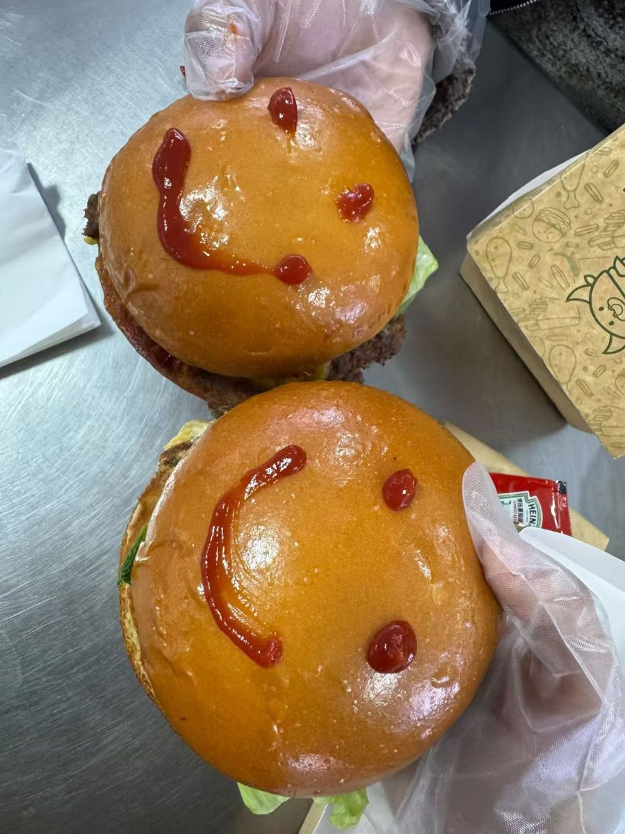 不锈钢台面泛着冷光,衬得两只被手套托着的汉堡格外暖——面包胚是油亮的焦糖色,像刚从烤箱里滚过一层蜂蜜,表面凝着细密的光泽,随着手的轻晃微微晃动。挤在面包上的番茄酱还带着温度,弯成两个软乎乎的笑眼,下面缀着三两点小圆,像是谁随手画了两张没睡醒的笑脸。左边那只的生菜叶从面包缝里探出来一点,边缘还沾着些透明的沙拉酱;右边这只的面包底下,能看见焦褐的肉饼边缘,裹着一丝若有若无的肉香。旁边的牛皮纸盒子印着卡通小人,红白包装的酱料斜斜靠着,连台面上的白色纸巾都带着被食物热气熏软的褶皱。空气里混着面包的麦香、肉饼的焦香,还有番茄酱酸甜的气息,两只“笑脸”像是在说“快吃掉我呀”,让人忍不住想咬开那层脆壳,听生菜在齿间发出清爽的声响,让热乎的肉汁漫过舌尖。