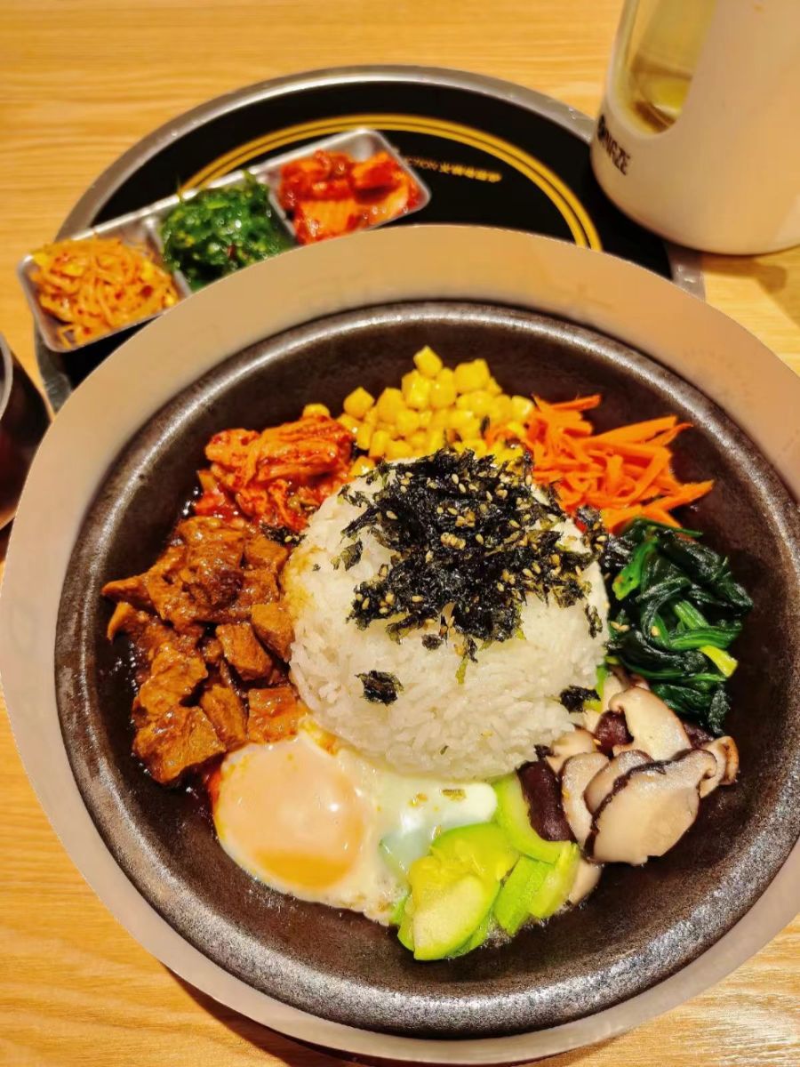 刚端上桌的石锅还带着热乎气,白米饭堆成小丘,顶铺着海苔碎混着芝麻,香得直钻鼻尖。
