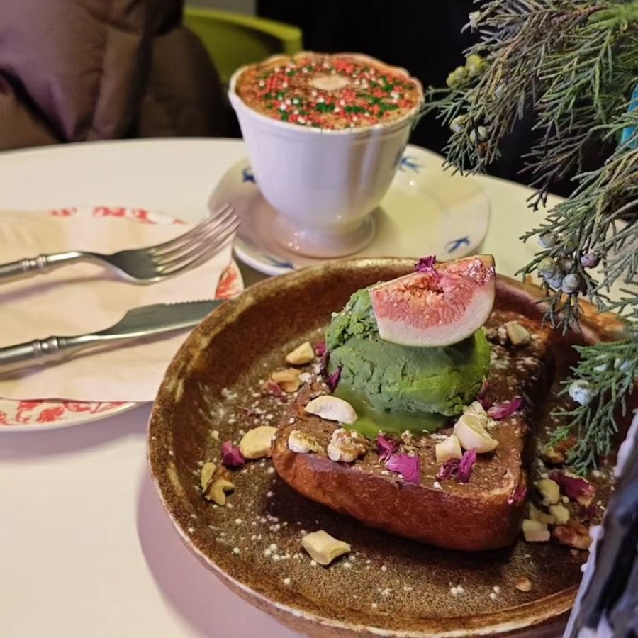 冬日的午后,推开街边小店的玻璃门,暖融融的香气便裹着温柔的灯光扑面而来。视线落定在餐桌中央的陶盘上时,心跳都跟着慢了半拍——那抹浓绿的抹茶冰淇淋卧在厚切法式吐司上,像把春日的青山揉碎了搁在冬日的甜暖里。
