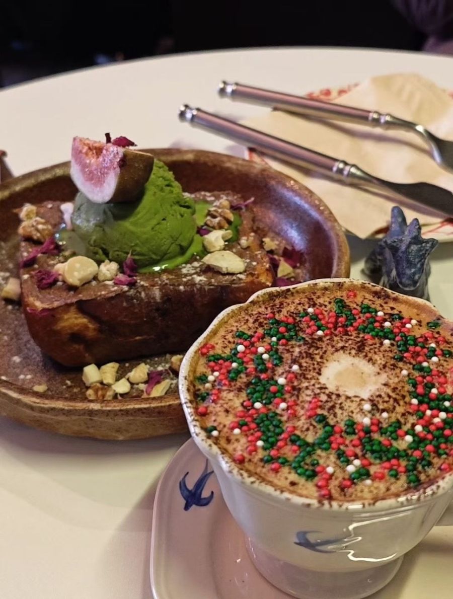 手边的热可可更是冬日标配,奶泡绵密得能托起勺子,红绿白的糖珠撒在表面,像把圣诞的星光揉进了饮品里。可可的醇厚混着奶香滑进喉咙,暖意从胃里一路漫到四肢。金属刀叉在白瓷盘边泛着微光,窗外的暮色渐浓,而眼前这一盘一盅的甜,把所有的寒意都隔绝在外,只剩舌尖的温柔与心头的安稳,在这一刻缠成了最动人的模样。
