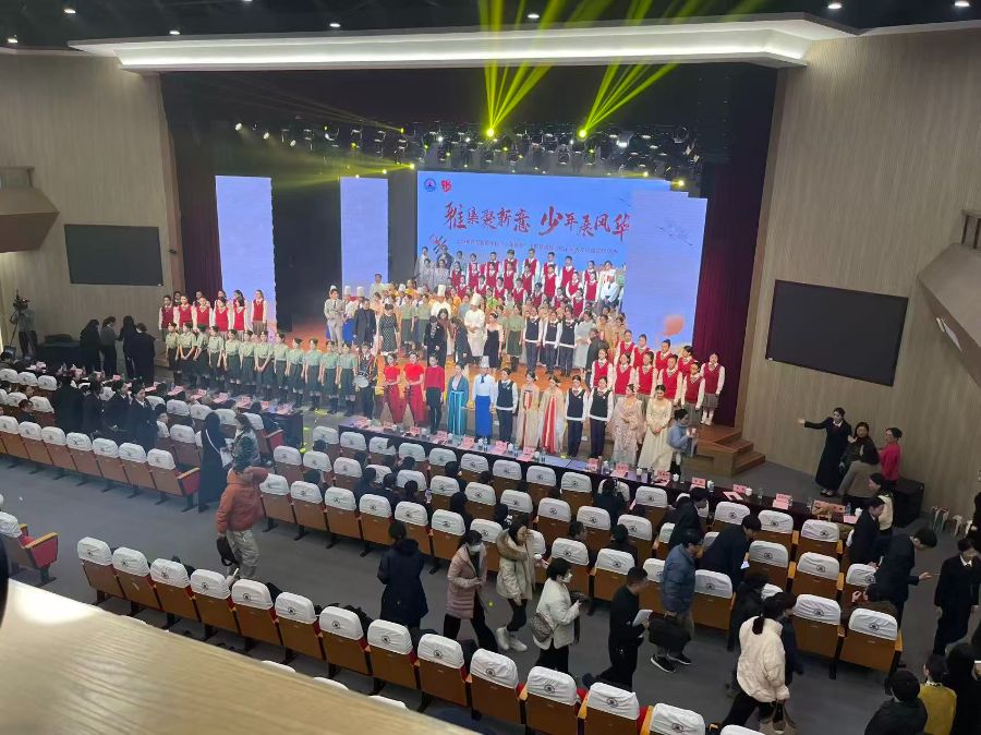 这张照片定格了学校元旦晚会落幕时的温馨瞬间,舞台上演员们齐聚合影,成为全场最亮眼的风景。背景大屏上“雅集聚新意 少年展风华”的主题字样醒目亮眼,暖黄的舞台灯光斜斜洒落,与大屏的蓝紫色调交织,为现场晕染出热闹又梦幻的节日氛围。