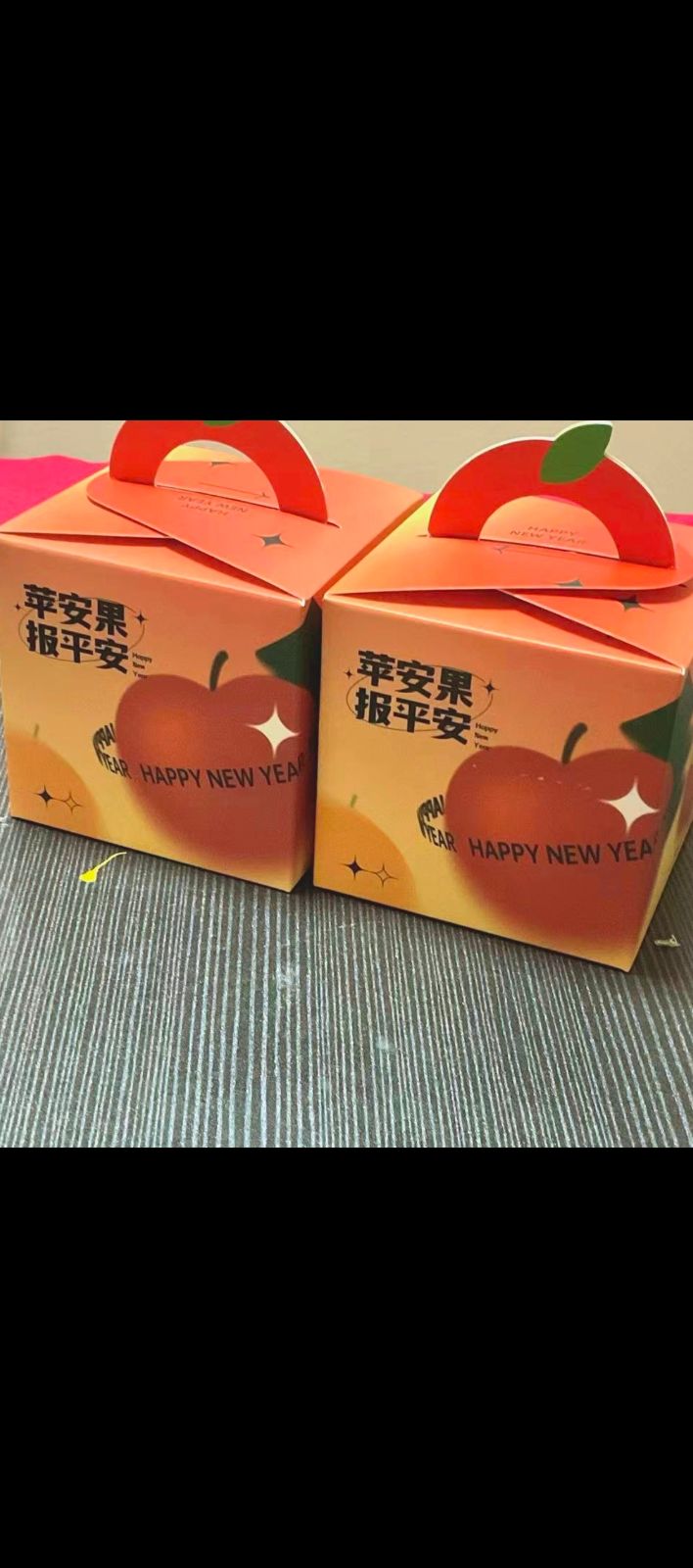 礼盒的提手做成了苹果蒂的模样,红得鲜亮的卡纸卷成弧形,还缀着一小片翠绿的叶子,仿佛刚从枝头摘下来的新鲜苹果,憨态可掬。两个礼盒紧紧靠在一起,边角的弧度圆润柔软,橘黄的底色在灯光下泛着温柔的光泽,像是把一整个冬天的暖意都封存在了纸壳里。