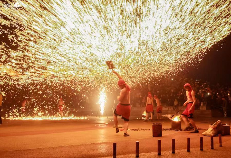 不同地域的打铁花,还形成了各具特色的表演风格。在河南确山,打铁花以“场面宏大、气势磅礴”著称,常常是数十名匠人同时表演,铁花漫天飞舞,覆盖范围广,宛如火海翻腾;山西的打铁花则更注重“精巧灵动”,匠人会通过调整拍打力度,让铁花呈现出不同的形态,有时如细雨纷飞,有时如繁花簇拥;河北的部分地区还会将打铁花与舞龙、秧歌等民俗结合,在铁花的映衬下,龙身飞舞、鼓点铿锵,氛围感更为热烈。这些地域特色,让打铁花不仅是一项技艺,更成为展现当地民俗文化的重要载体。