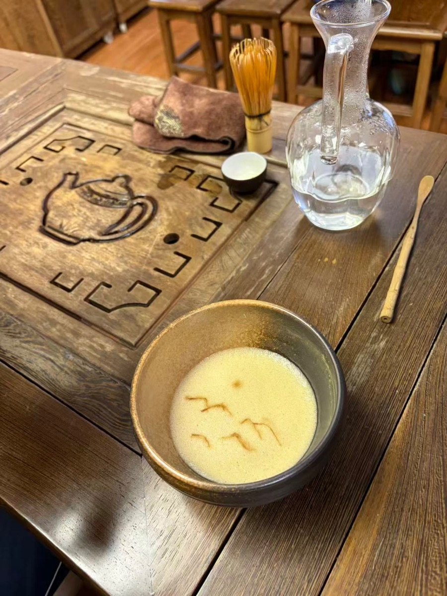轮到自己实操时,才知看似简单的步骤藏着诸多讲究。调膏时水量把控不当,茶末结块难融,我急得鼻尖冒汗,老师轻声指点我顺时针慢搅,力道由轻及重。待茶汤渐趋细腻,我举起茶筅,学着老师的模样上下击拂,手腕酸痛也不敢停歇,看着茶末与沸水在盏中碰撞、交融,慢慢泛起一层洁白的泡沫,心中满是欢喜。