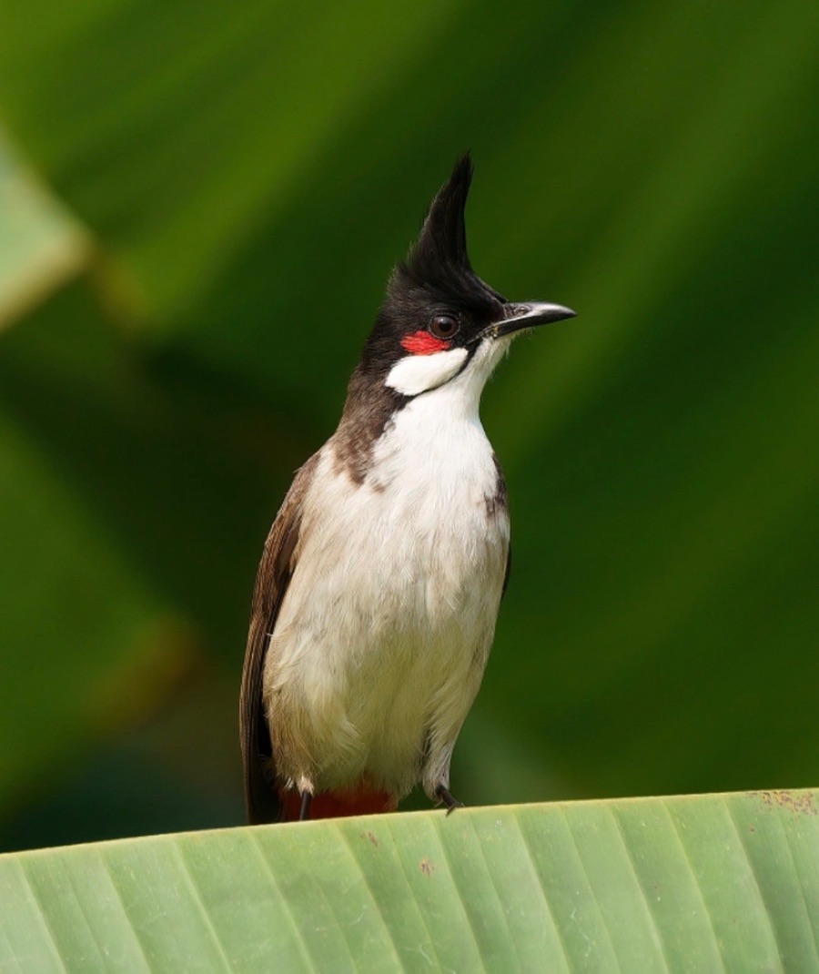 红耳鹎是一种常见的小型鸣禽,体长约 18 至 20 厘米,外形十分醒目。它头顶有标志性的黑色羽冠,眼后有一块鲜红色斑点,如同戴了 “红耳坠”,因此得名。下体白色,尾下覆羽呈鲜艳的红色,整体配色活泼灵动。红耳鹎主要栖息在树林、果园、公园和庭院中,喜欢成群活动,性格活泼好动,常在枝头跳跃觅食。它们以植物果实、种子和昆虫为食,叫声清脆响亮,辨识度很高。