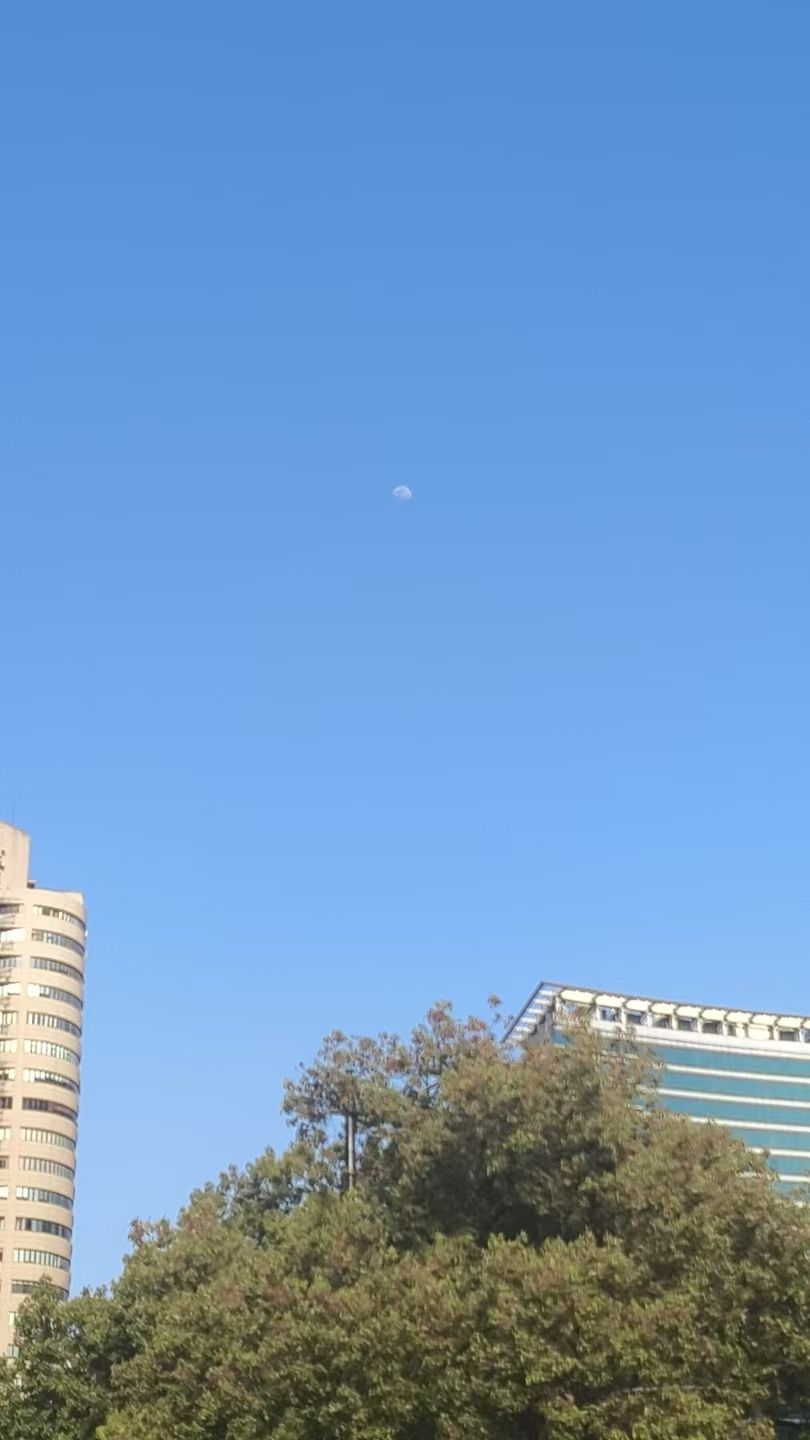 澄澈的蓝天像被洗过一样干净,澄澈透亮。白日里,月亮悄悄挂在天际,与蓝天相映成趣,温柔又静谧。城市的高楼与葱郁的树木静静伫立,时光仿佛慢了下来。抬头遇见这样的美好,瞬间被治愈,原来生活里藏着这么多不期而遇的温柔与浪漫。