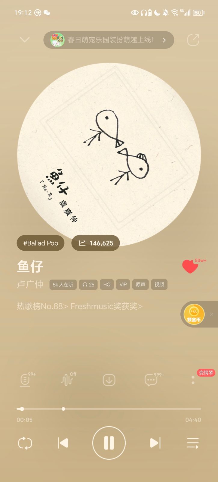 这是音乐播放软件的截图,正在播放卢广仲的治愈系民谣《鱼仔》。界面采用暖米黄色调,背景是简约的手绘圆形封面:两只线条稚拙的小鱼相对而游,搭配手写体“鱼仔 卢广仲”,充满日系治愈感。中间标注#Ballad Pop标签、146625的热度值,5k人在听,显示歌曲登上热歌榜No.88、获Freshmusic奖,收藏量50w+。底部播放栏显示歌曲播放至00:05,总时长04:40,评论区999+,还有“变钢琴”等功能按钮。整体设计清新柔和,完美契合歌曲温暖治愈的曲风,是适合循环的宝藏单曲界面