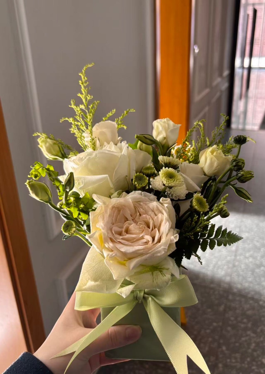 在修剪枝叶的过程中,我学会了观察每一朵花的生长方向与最佳展示角度。有时需要大胆剪去多余的枝叶,有时又要小心翼翼地保留那些看似杂乱却充满生机的部分。当浅绿色的丝带在指尖缠绕,打出一个完美的蝴蝶结时,整个作品仿佛被赋予了灵魂。