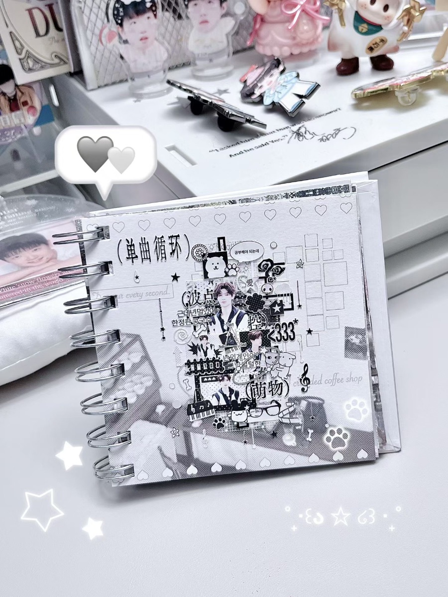 这是一本充满巧思的黑白爱豆手账拼贴,以冷调的黑白灰构建出清爽又治愈的追星氛围。