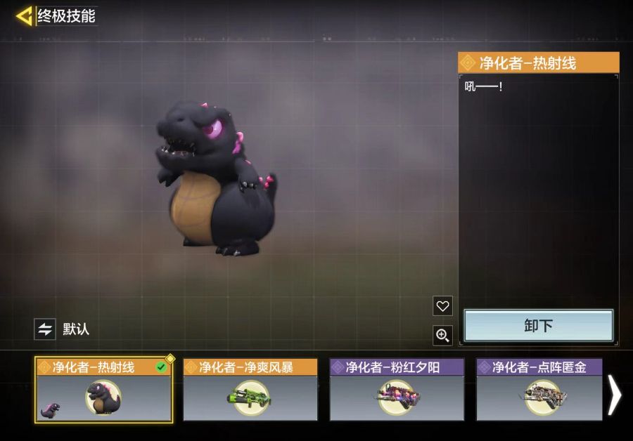 这是《使命召唤手游》的终极技能界面,呈现了与哥斯拉联动的“净化者”主题内容。画面中央是一只Q版小哥斯拉,通体漆黑,腹部为浅棕,背鳍和眼部泛着亮眼的粉紫色,圆滚滚的造型自带反差萌。它正是当前选中的“净化者-热射线”技能,右侧还配有专属语音“吼——!”。