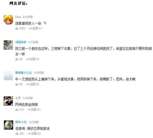 昨天18:58,网友 @落枫雨love 发微博:小区有个女的从六楼摔下来,居然没受什么伤。